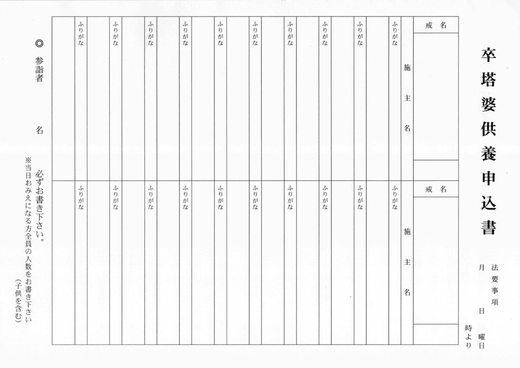 お塔婆の正式名は卒塔婆といい、亡くなった人へ今の想いを伝える感謝報恩の表れを示すものです。ひらたく言うと、 亡くなった方への感謝の気持ちを示すお手紙のようなものです。 金蔵院では故人様の戒名や、お申し込みいただいた方のお名前を書き入れますが、ご先祖おひとりずつ、または「先祖代々」でひとつにまとめてお渡しします。 お申し込みはお電話でお申し込みいただくか、申込用紙にご記入の上、ファックスでお送り下さい(当寺FAX番号:045-754-0123)。
